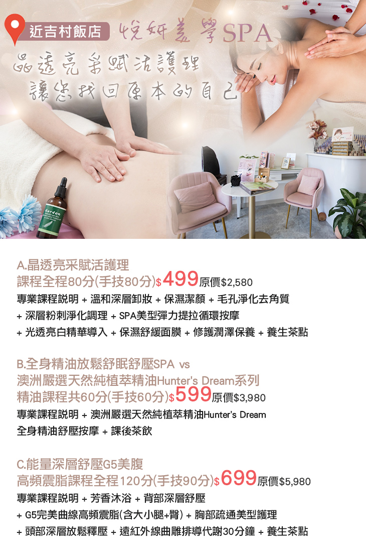 A.晶透亮采賦活護理課程全程80分(手技80分) / B.全身精油放鬆舒眠舒壓SPA vs 澳洲嚴選天然純植萃精油Hunter's Dream系列精油課程共60分(手技60分) / C.能量深層舒壓G5美腹高頻震脂課程全程120分(手技90分)