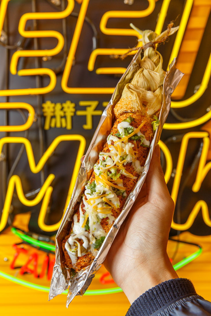 現點現做的辮子玉米,店家發揮創意將玉米鬚手工紮成三角辮子,造型酷炫新穎,才剛到手,手機忍不住先拍再說!如此魅力難擋的玉米,選用本土在地高達18度甜度的玉米,不同於一料理玉米的方式,店家選擇用炸的手法呈現玉米的自然風味,再加上自製墨西哥美乃滋、莎莎醬及起司增添香氣與口感,玉米粒飽滿香甜,鹹中帶點甜的美妙滋味在口中奔放,一口嚐盡,幸福滋味不停在心中翻轉、跳躍!