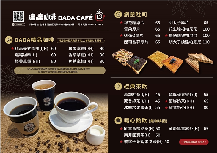 無論是準備振奮精神前往公司上班的早晨,或嘴饞著想忙裡偷閒的午後,抑或是下班後帶著從公事中退出的滿身疲憊,【DADA CAFE 達達咖啡】都要為您奉上一份烹烤得酥香誘人的吐司小點,以及一杯療癒身心的咖啡、茶飲!