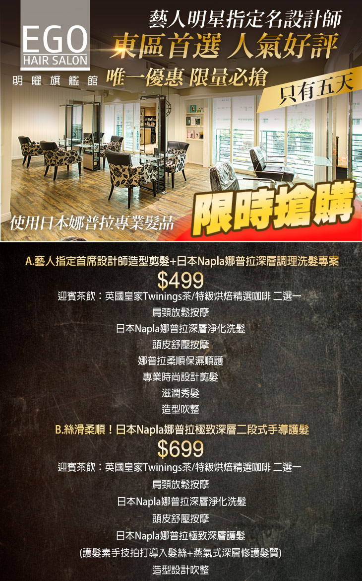這裡也是東區貴婦名媛指定美髮造型口袋名單,EGO Hair Salon(明曜旗艦館)釋出優惠方案,適合品味挑剔又具備時尚感的你前來朝聖。