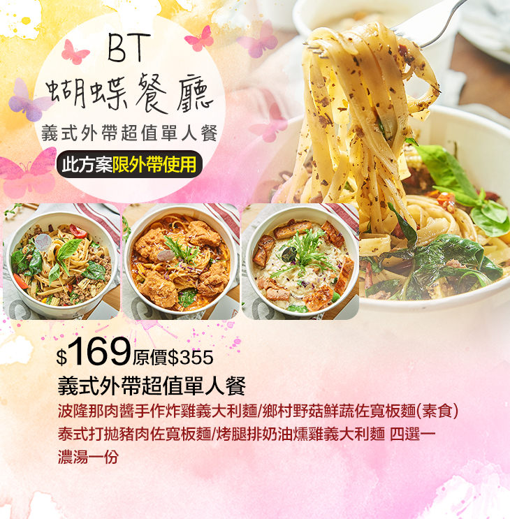 【BT蝴蝶餐廳】除了環境優美,餐點更是美味、特別!無論是清新爽口的花園沙拉、異國特色風味的手作義大利麵、精緻小巧的花漾甜點......,不同品項類別,皆帶給老饕您不同的味蕾體驗!
