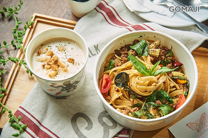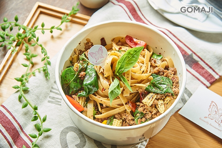 料理無國界!這點【BT蝴蝶餐廳】可是做得相當成功喔!將寬板麵條,加入預先以豬絞肉、黃金比例泰式風味調醬及番茄、九層塔爆香的醬汁基底拌炒,上色且入味,鹹香酸甜的多重滋味在齒舌間不斷盤旋 ~ 無論四季來上一份,爽口清新無負擔喔!