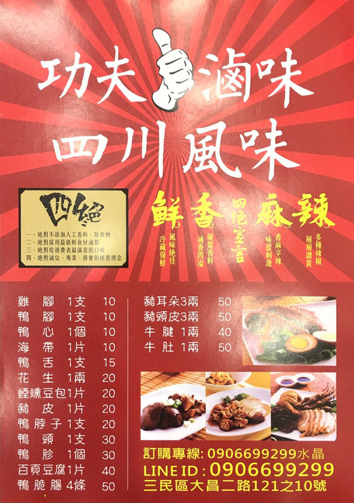 位於高雄市三民區大昌二路的〝功夫滷味〞,專賣四川滷味,有別於一般台式滷味鹹香的口感,四川味更將鮮香麻辣的精髓完整釋放,深紅色的招牌在騎樓上格外搶眼,透過冷凍櫃擺放各式新鮮食材,真材實料看得見,搭配上等香料與多種辣椒熬煮一番後,滷香四溢、香麻辛辣,挑逗您的味覺神經,一吃成主顧!