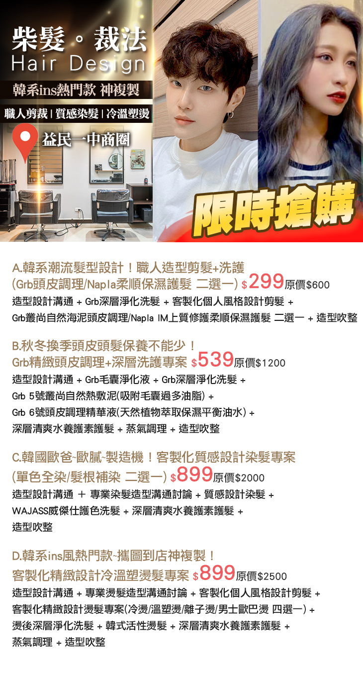 A.韓系潮流髮型設計!職人造型剪髮+洗護(Grb頭皮調理/Napla柔順保濕護髮 二選一) / B.秋冬換季頭皮頭髮保養不能少!Grb精緻頭皮調理+深層洗護專案 / C.韓國歐爸~歐膩~製造機!客製化質感設計染髮專案(單色全染/髮根補染 二選一) / D.韓系ins風熱門款~攜圖到店神複製!客製化精緻設計冷溫塑燙髮專案