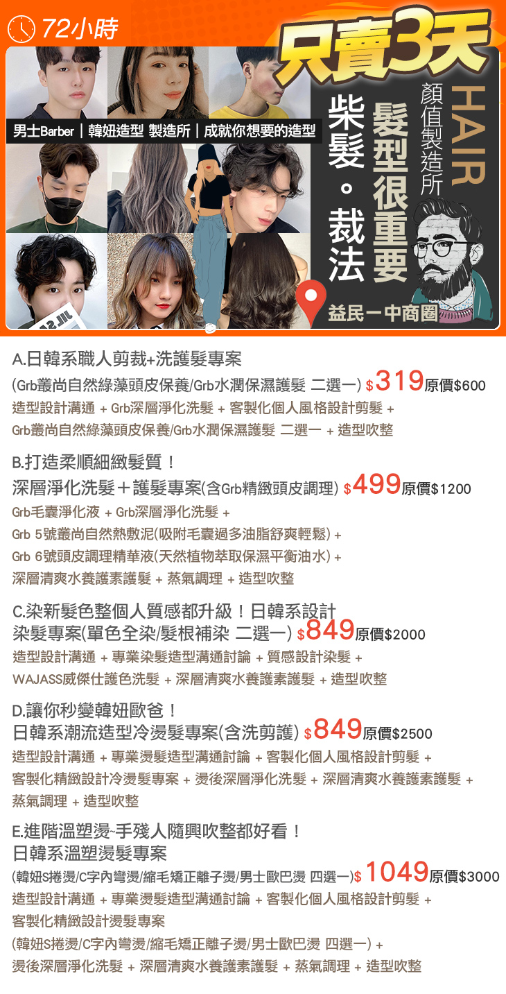 A.日韓系職人剪裁+洗護髮專案(Grb叢尚自然綠藻頭皮保養/Grb水潤保濕護髮 二選一) / B.打造柔順細緻髮質!深層淨化洗髮+護髮專案(含Grb精緻頭皮調理) / C.染新髮色整個人質感都升級!日韓系設計染髮專案(單色全染/髮根補染 二選一) / D.讓你秒變韓妞歐爸!日韓系潮流造型冷燙髮專案(含洗剪護) / E.進階溫塑燙~手殘人隨興吹整都好看!日韓系溫塑燙髮專案(韓妞S捲燙/C字內彎燙/縮毛矯正離子燙/男士歐巴燙 四選一)