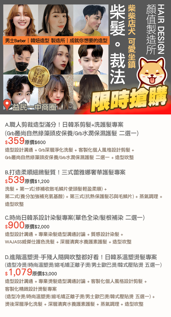 A.職人剪裁造型滿分!日韓系剪髮+洗護髮專案(Grb叢尚自然綠藻頭皮保養/Grb水潤保濕護髮 二選一) / B.打造柔順細緻髮質!三式蕾雅娜奢華護髮專案 / C.時尚日韓系設計染髮專案(單色全染/髮根補染 二選一) / D.進階溫塑燙~手殘人隨興吹整都好看!日韓系溫塑燙髮專案(造型冷燙/時尚溫塑燙/縮毛矯正離子燙/男士歐巴燙/韓式壓貼燙 五選一)
