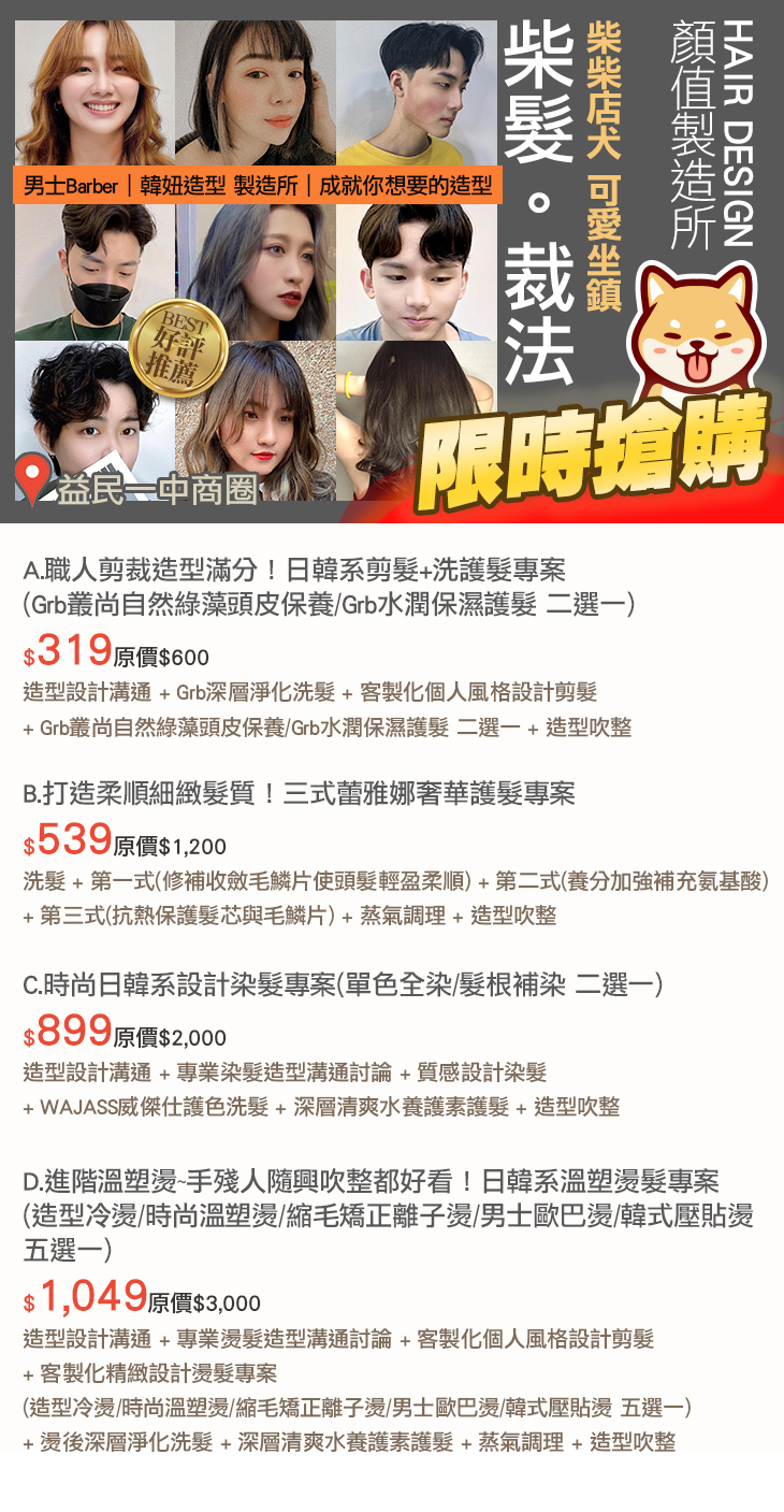 A.職人剪裁造型滿分!日韓系剪髮+洗護髮專案(Grb叢尚自然綠藻頭皮保養/Grb水潤保濕護髮 二選一) / B.打造柔順細緻髮質!三式蕾雅娜奢華護髮專案 / C.時尚日韓系設計染髮專案(單色全染/髮根補染 二選一) / D.進階溫塑燙~手殘人隨興吹整都好看!日韓系溫塑燙髮專案(造型冷燙/時尚溫塑燙/縮毛矯正離子燙/男士歐巴燙/韓式壓貼燙 五選一)