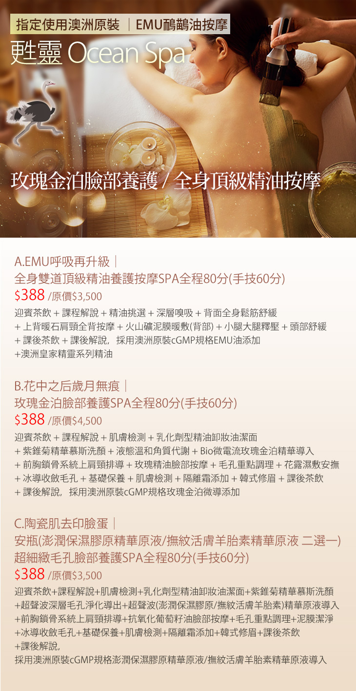 A.EMU呼吸再升級|全身雙道頂級精油養護按摩SPA全程80分(手技60分) / B.花中之后歲月無痕|玫瑰金泊臉部養護SPA全程80分(手技60分) / C.陶瓷肌去印臉蛋|安瓶(澎潤保濕膠原精華原液/撫紋活膚羊胎素精華原液 二選一)超細緻毛孔臉部養護SPA全程80分(手技60分)