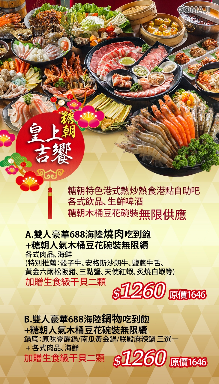 A.雙人豪華688海陸燒肉吃到飽+糖朝人氣木桶豆花碗裝無限續 / B.雙人豪華688海陸鍋物吃到飽+糖朝人氣木桶豆花碗裝無限續;A.B.方案皆加贈生食級干貝二顆