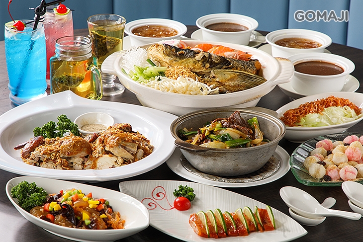 〈雲耳蜇頭一份 + 鳳梨蝦球/塔香茄腸煲/薑蔥牛肉煲/麻香松阪豬/橙汁排骨 任選二 + 腐乳空心菜/櫻花蝦高麗菜 任選一 + 花好月圓一份 + 甜點冰飲:冰糖燉銀耳/棗泥核桃露/蜜桃繽紛(調酒)/閃電檸檬汁(調酒) 任選二〉