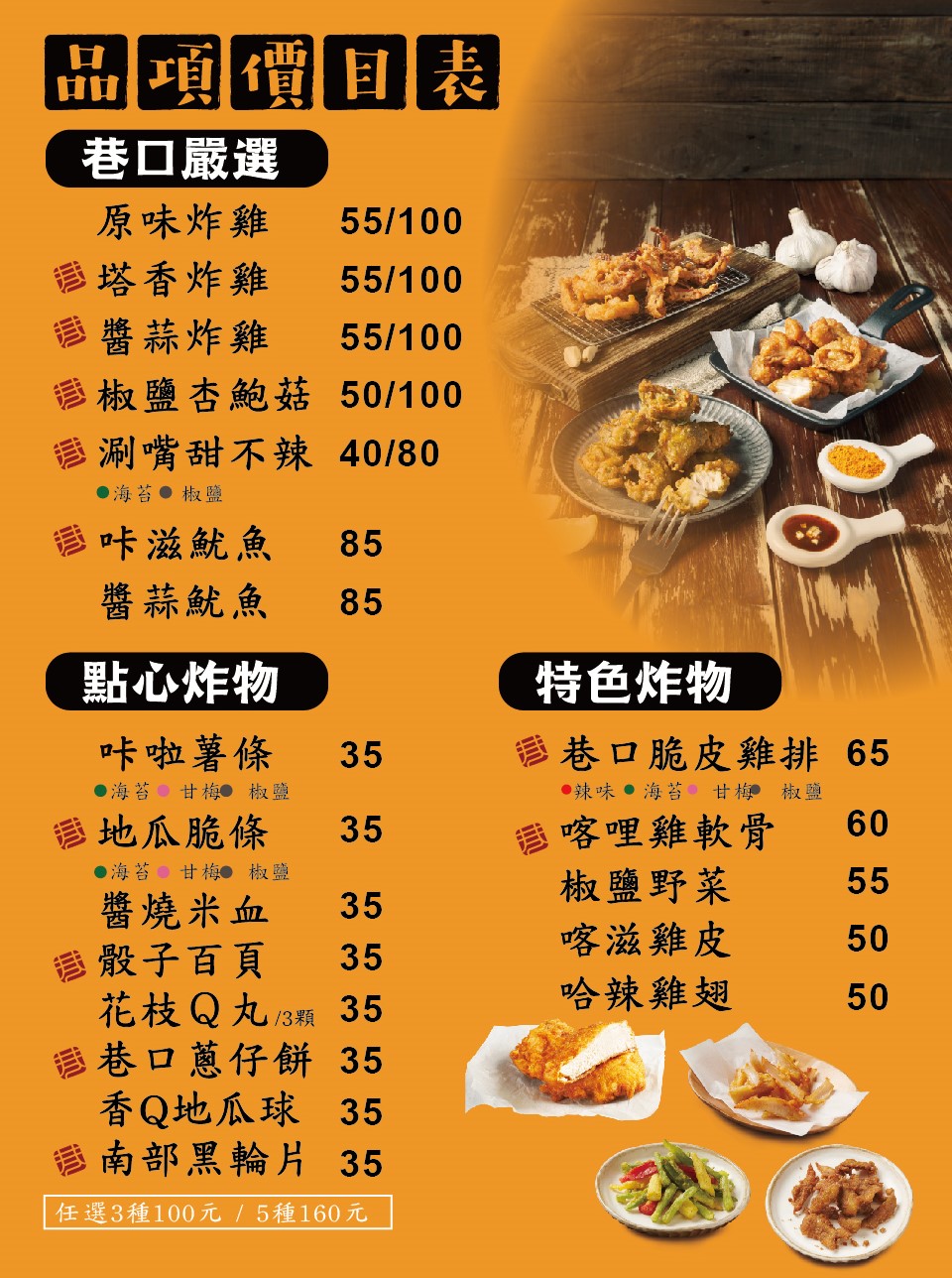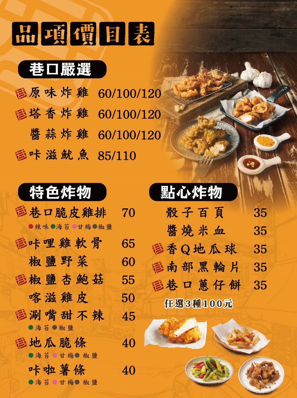 與固定廠商批貨,確保食材的品質與產源!再結合自家獨門秘方,讓炸物嚐起來除了必備的酥脆香,口感更是與一般市售的有些許不一樣!不但不油膩,更添一股難以言喻的滋味,讓老饕您首次品嚐便敗倒於它的魅力之下!