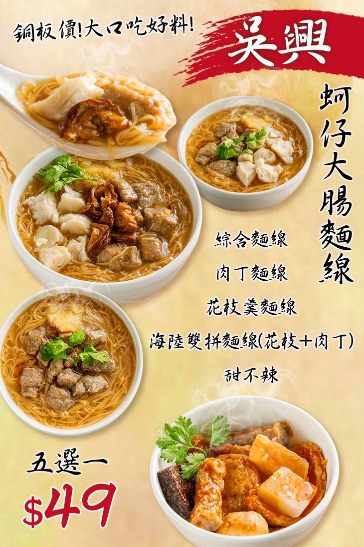 首次合作精選店家!位於新北市新莊區中港一街38號的吳興蚵仔大腸麵線(新莊店),結合中西式烘培、口味獨特的小店,每日烹煮的美味可讓不少饕客回味無窮,熱騰騰的麵線一上桌,香氣撲鼻!精選各式新鮮食材、老闆用心烹煮美味,色澤鮮美的甜不辣同樣不容錯過,店家也有提供室內座位,環境簡雅大方,在冬日吃上一碗麵線暖心又暖胃!