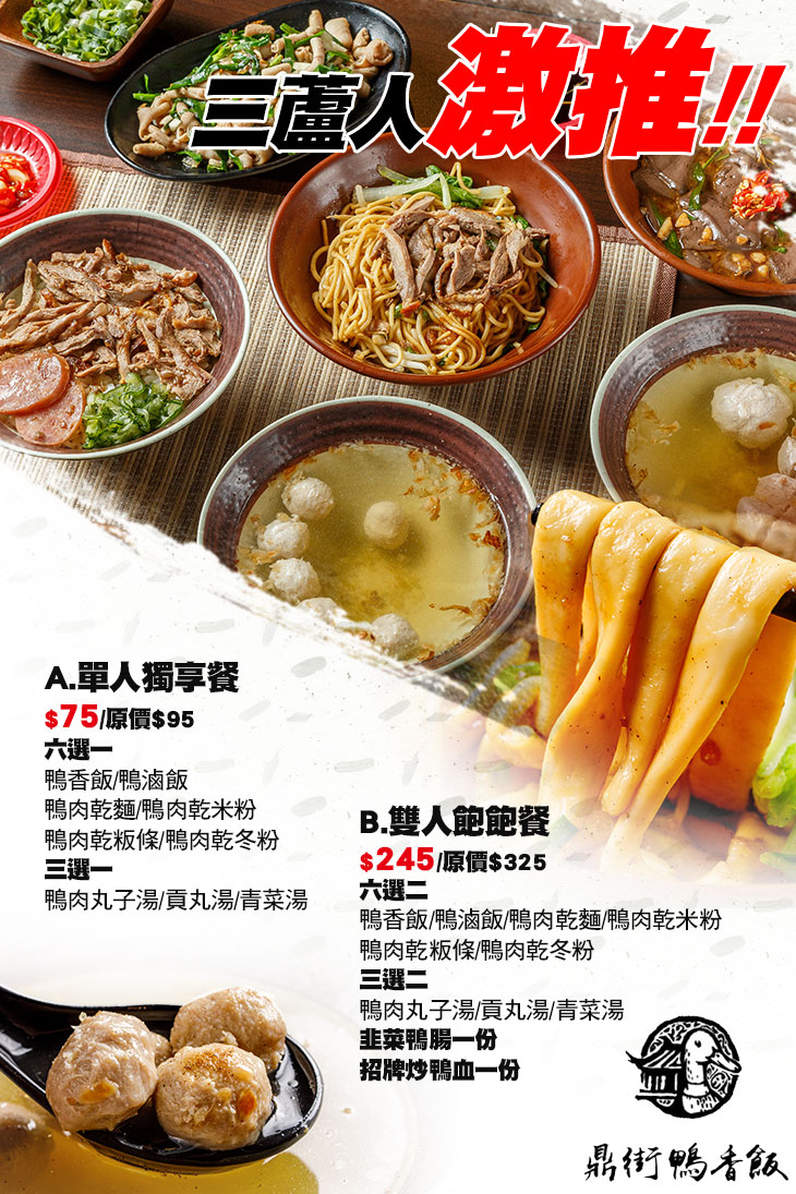 鼎街鴨香飯創始店位於三重碧華寺廟商圈附近,這裡台灣最美的街邊景象跟美味食材,一次讓您同時體驗!鼎街提供所有與「鴨」相關的料理,食材均由店長每日親自到市場挑選,以確保品質及穩定的新鮮度。除了招牌鴨香飯是經典之外,還有鴨滷飯、鴨肉乾麵、鴨肉乾米粉等餐點可選擇,在食材的挑選、口味的調配、擺盤的豐盛上,店家都掌握得恰到好處,因此吸引許多饕客前來探索這份令人心動的美味!