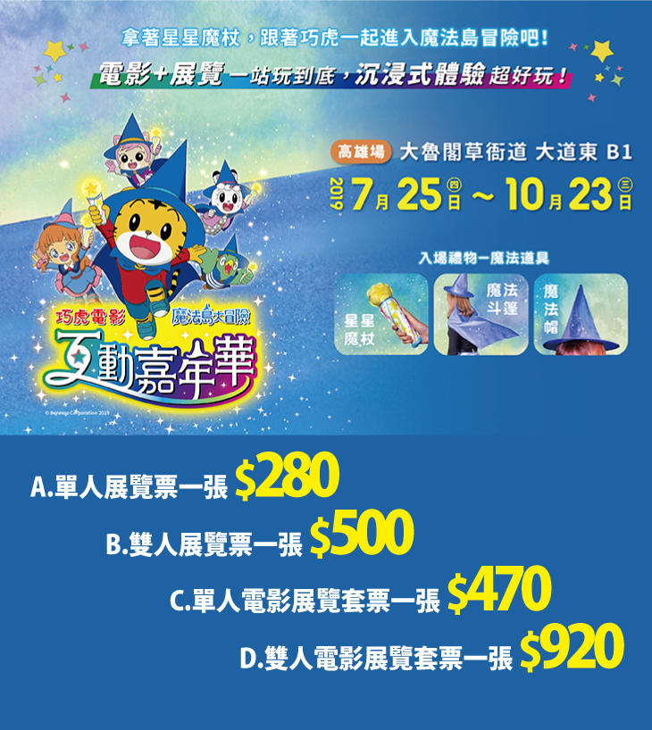 只要280元起,即可享有【巧虎電影互動嘉年華魔法島大冒險(高雄場)】A.單人展覽票一張 / B.雙人展覽票一張 / C.單人電影展覽套票一張 / D.雙人電影展覽套票一張