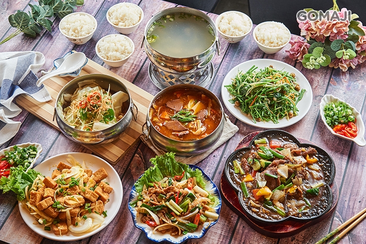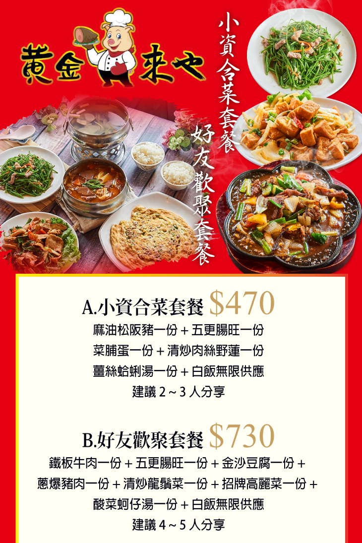 〈鐵板牛肉一份 + 五更腸旺一份 + 金沙豆腐一份 + 蔥爆豬肉一份 + 清炒龍鬚菜一份 + 招牌高麗菜一份 + 酸菜蚵仔湯一份 + 白飯無限供應〉建議 4 ~ 5 人分享