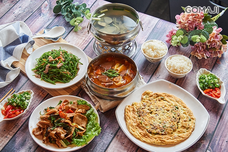 〈麻油松阪豬一份 + 五更腸旺一份 + 菜脯蛋一份 + 清炒肉絲野蓮一份 + 薑絲蛤蜊湯一份 + 白飯無限供應〉建議 2 ~ 3 人分享