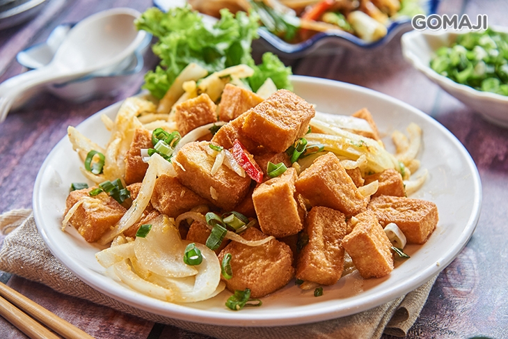 炸至金黃酥脆的炸豆腐,咬下去內餡汁液緩緩流出,豆腐的香氣頓時四溢瀰漫,撒上蔥花與洋蔥增添口感,令人忍不住一塊又一塊的送入口中~不斷品嚐!