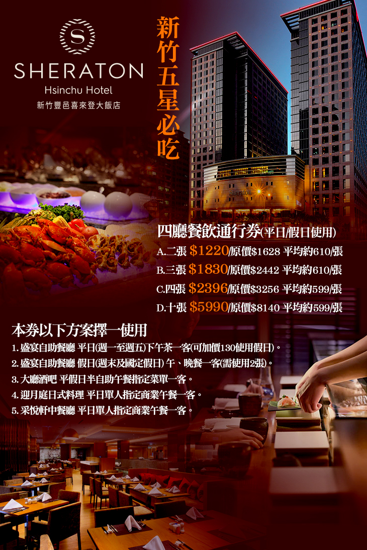 [即期優惠餐券]新竹五星必吃!四廳餐飲通行券(平日/假日使用;特別推薦:盛宴自助吃到飽)