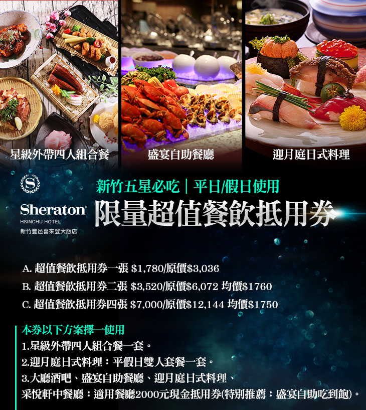 限量新竹五星必吃!平日/假日使用,超值餐飲抵用券 (擇一使用:迎月庭日式料理平假日雙人套餐/外帶四人組合餐/適用餐廳2000元現金抵用券(特別推薦:盛宴自助吃到飽)) (部分假日除外,詳細依券面/飯店為主)