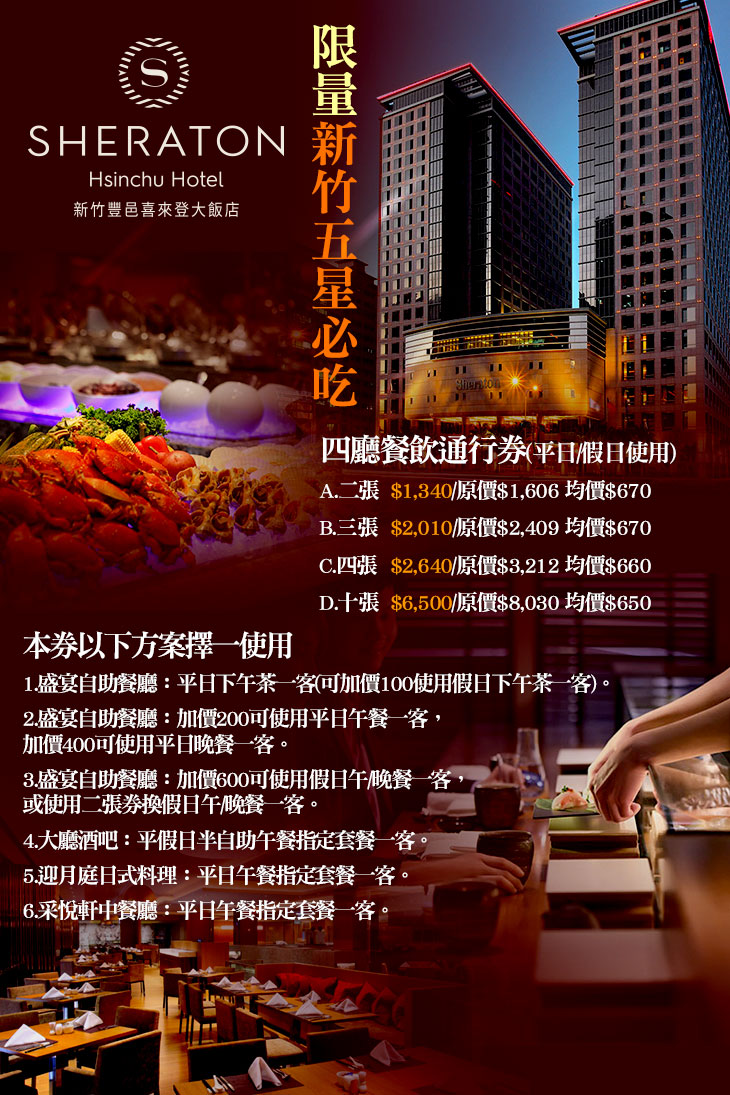 限量新竹五星必吃!四廳餐飲通行券(平日/假日使用;特別推薦:盛宴自助吃到飽) (部分假日除外,詳細依券面/飯店為主)