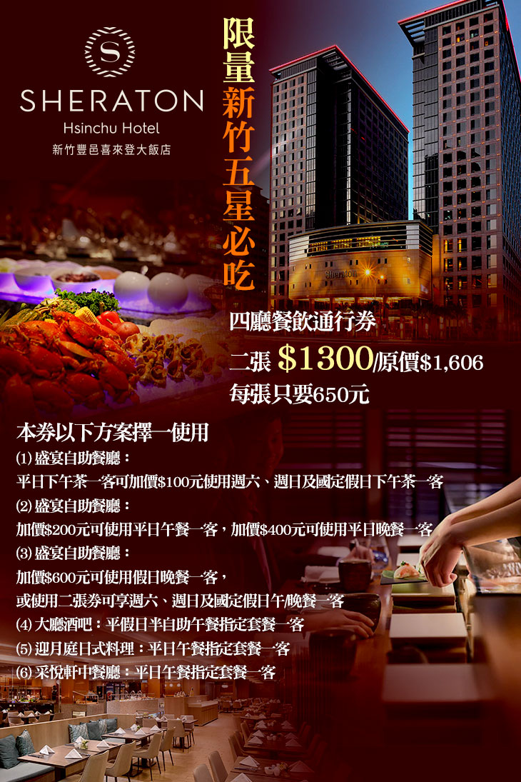 限量新竹五星必吃!四廳餐飲通行券(平日/假日使用;特別推薦:盛宴自助吃到飽)(部分假日除外,詳細依券面/飯店為主)(二張一組即出貨)
