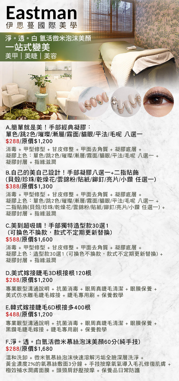 A.簡單就是美!手部經典凝膠:單色/跳2色/璀璨/漸層/霧面/貓眼/平法/毛呢 八選一 / B.自己的美自己設計!手部凝膠八選一+二指貼飾(貝殼/珍珠/乾燥花/雲錦粉/貼紙/鉚釘/亮片/小鑽 任選一) / C.美到超吸睛!手部獨特造型款30選1 (可換色不換款,款式不定期更新替換) / D.美式嫁接睫毛3D根接根120根 / E.韓式嫁接睫毛6D根接多400根 / F.煥然一新!淨。透。白氫活微米慕絲泡沫美顏60分(純手技)