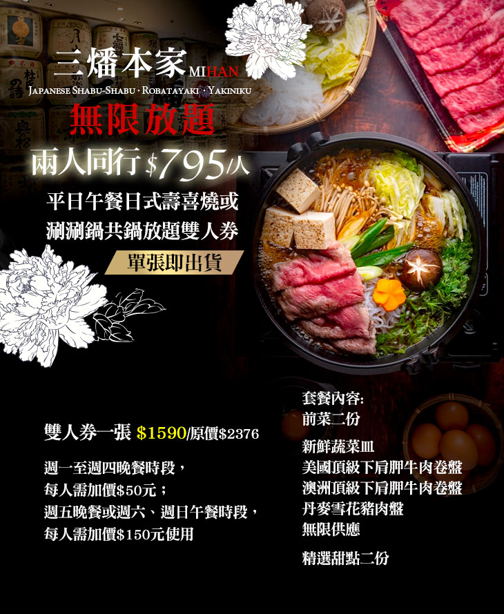 (限時!單張即出貨)平日午餐日式壽喜燒或涮涮鍋共鍋放題雙人券(週一至週四晚餐時段,毎人需加價$50元;週五晚餐或週六、週日午餐時段,毎人需加價$150元使用