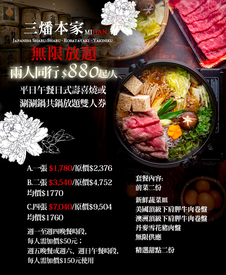 平日午餐日式壽喜燒或涮涮鍋共鍋放題雙人券(週一至週四晚餐時段,毎人需加價$50元;週五晚餐或週六、週日午餐時段,毎人需加價$150元使用)