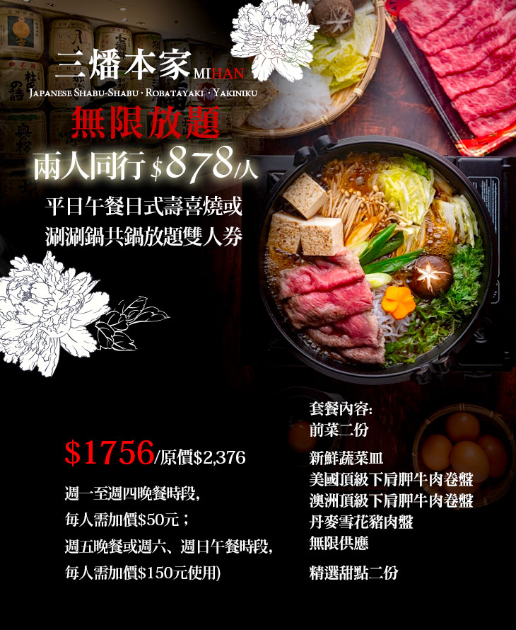 (單張即出貨)平日午餐日式壽喜燒或涮涮鍋共鍋放題雙人券(週一至週四晚餐時段,毎人需加價$50元;週五晚餐或週六、週日午餐時段,毎人需加價$150元使用)