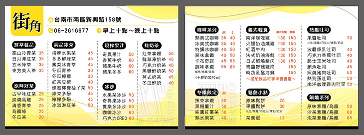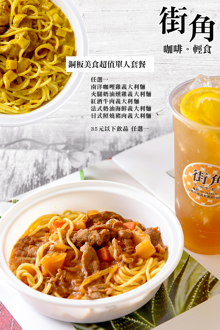 位於台南市南區新興路上,◤街角的濃情,香醇的咖啡,美味的輕食◢,在【街角 咖啡。輕食】可以放鬆心情,悠哉的喝上一杯香醇咖啡,享受忙碌過後的愜意,再搭配手作美味輕食,品味平凡中的不平凡,沉溺於生活中的悠閒!這回優惠釋出,讓您輕鬆品嚐美味的義大利麵,配上一杯特調飲品,享受平淡中的小確幸!