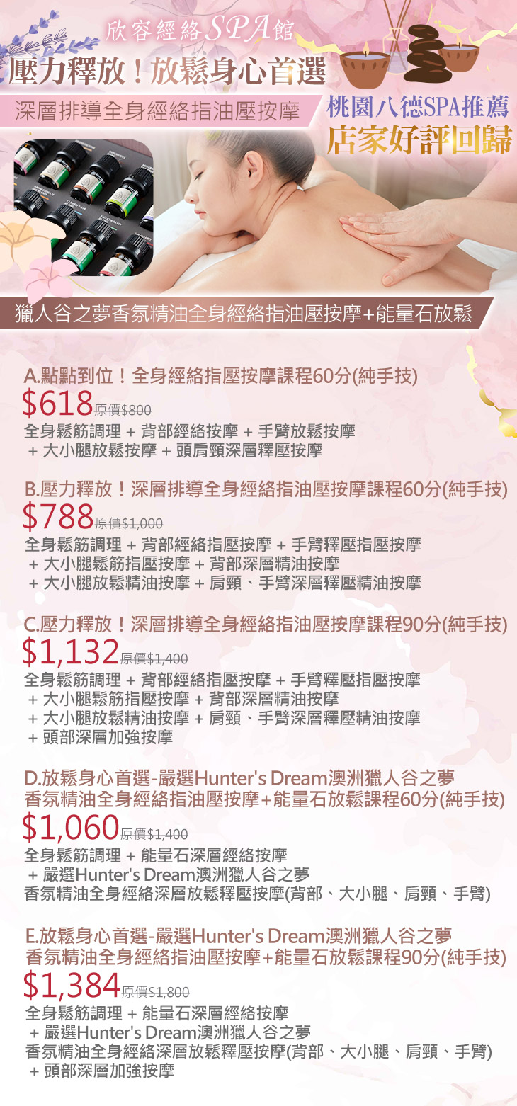 A.點點到位!全身經絡指壓按摩課程60分(純手技) / B.壓力釋放!深層排導全身經絡指油壓按摩課程60分(純手技) / C.壓力釋放!深層排導全身經絡指油壓按摩課程90分(純手技) / D.放鬆身心首選-嚴選Hunter's Dream澳洲獵人谷之夢香氛精油全身經絡指油壓按摩+能量石放鬆課程60分(純手技) / E.放鬆身心首選-嚴選Hunter's Dream澳洲獵人谷之夢香氛精油全身經絡指油壓按摩+能量石放鬆課程90分(純手技)