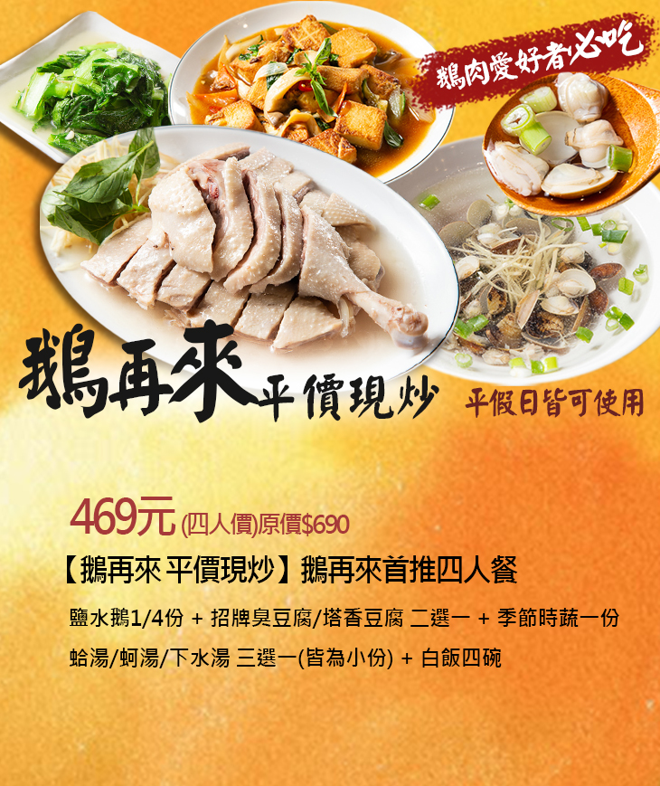 〈鹽水鵝1/4份 + 招牌臭豆腐/塔香豆腐 二選一 + 季節時蔬一份 + 蛤湯/蚵湯/下水湯 三選一(皆為小份) + 白飯四碗〉