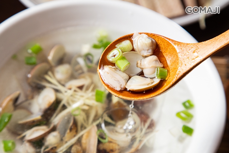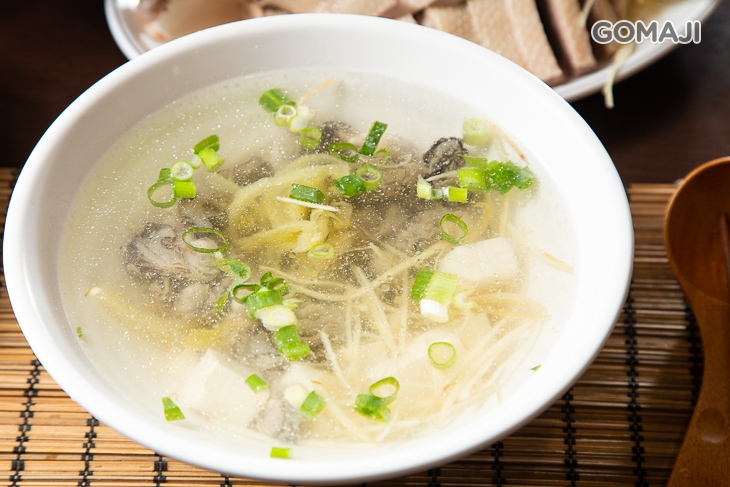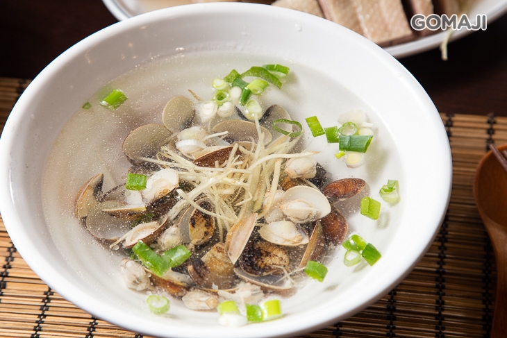 清澈的湯頭,喝來溫潤甘醇、不厚重,湯裡頭有蛤蜊、蔥花和筍絲,帶有一絲蛤蜊的鮮甜,清爽可口,於濃厚菜色後品嚐剛好舒緩味蕾,平衡嘴裡的油膩和重口味,喝完身心也會感到十分溫暖。