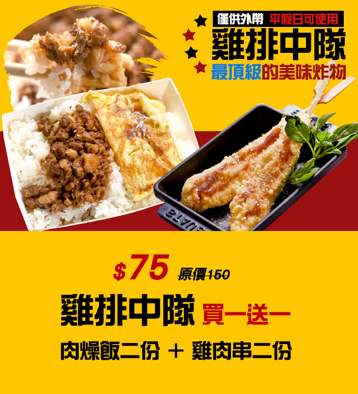 買一送一 〈肉燥飯二份 + 雞肉串二份〉