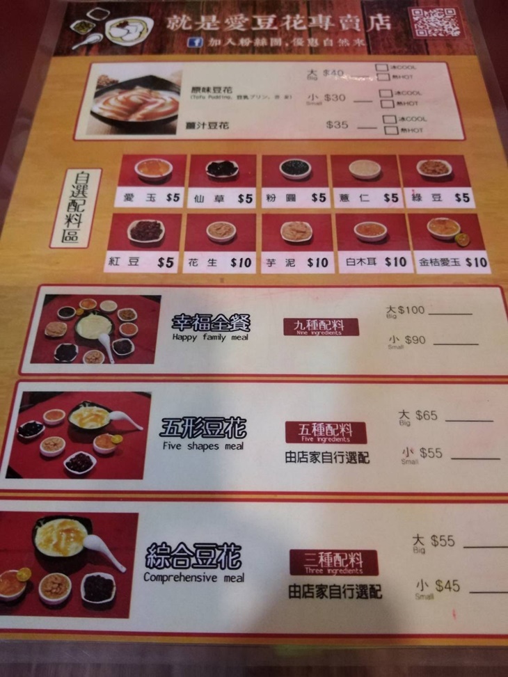 【就是愛豆花專賣店】除了提供多樣傳統美味的豆花讓饕客品嚐,更希望將「幸福」透過充滿愛的心與溫度的雙手傳遞給您,由九種配料相組而成的幸福組合,讓您一次享有九種食材帶來的風味與幸福。