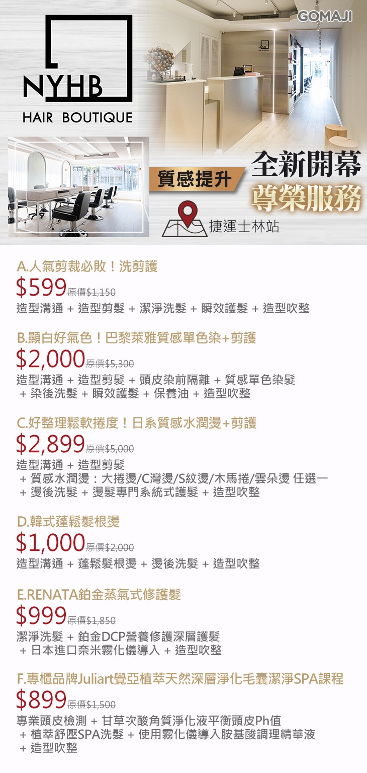 A.人氣剪裁必敗!洗剪護 / B.顯白好氣色!巴黎萊雅質感單色染+剪護 / C.好整理鬆軟捲度!日系質感水潤燙+剪護 / D.韓式蓬鬆髮根燙 / E.RENATA鉑金蒸氣式修護髮 / F.專櫃品牌Juliart覺亞植萃天然深層淨化毛囊潔淨SPA課程