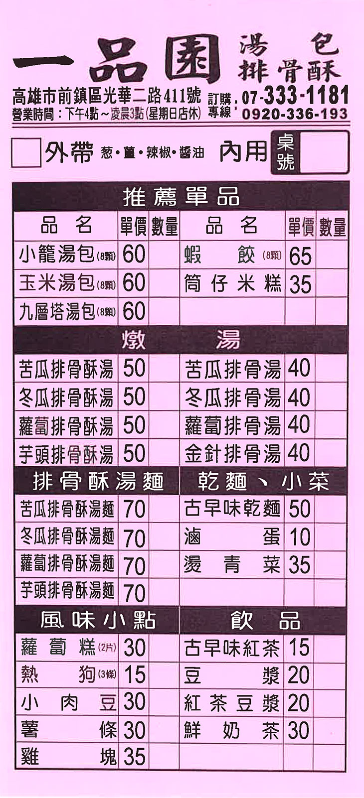 位於高雄市前鎮區光華二路411號,光華夜市內美食!堅持選用新鮮食材配合師傅的嫻熟手藝製作出道道美味,料鮮味美讓不少人一吃成主顧,小籠湯包、九層塔湯包、蝦餃、筒仔米糕、冬瓜酥排骨湯、芋頭排骨酥湯麵...多種美味通通,現在就快和家人好友一起來品嘗吧!