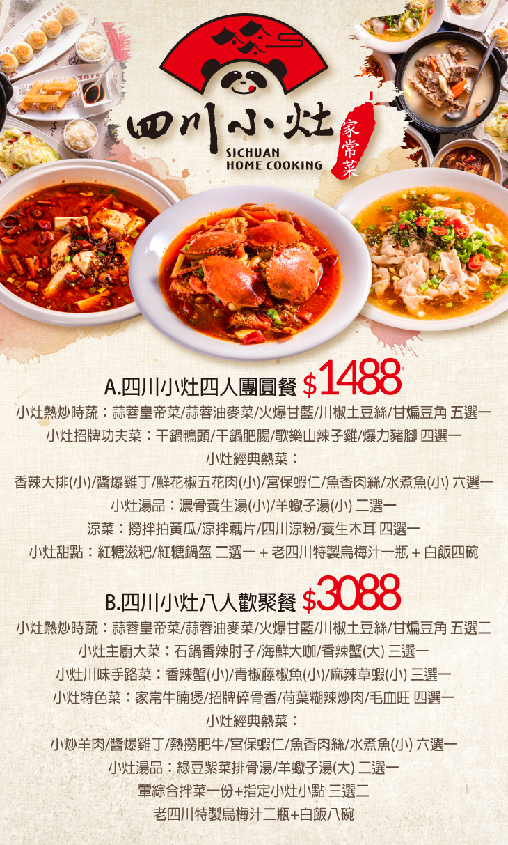 小灶熱炒時蔬:蒜蓉皇帝菜/蒜蓉油麥菜/火爆甘藍/川椒土豆絲/甘煸豆角 五選二+小灶主廚大菜:石鍋香辣肘子/海鮮大咖/香辣蟹(大) 三選一+小灶川味手路菜:香辣蟹(小)/青椒藤椒魚(小)/麻辣草蝦(小) 三選一+小灶特色菜:家常牛腩煲/招牌碎骨香/荷葉糊辣炒肉/毛血旺 四選一+小灶經典熱菜:小炒羊肉/醬爆雞丁/熱撈肥牛/宮保蝦仁/魚香肉絲/水煮魚(小) 六選一+小灶湯品:綠豆紫菜排骨湯/羊蠍子湯(大) 二選一+葷綜合拌菜一份+指定小灶小點 三選二+老四川特製烏梅汁二瓶+白飯八碗