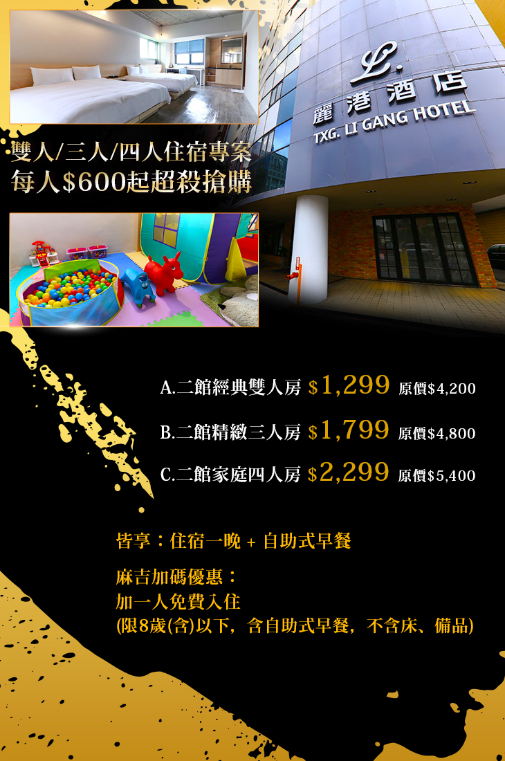 【台中-麗港酒店(二館)】感謝麻吉們熱烈搶購,已全數賣光光。