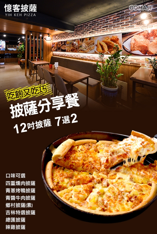 〈12吋披薩:四重燻肉披薩/青蔥烤鴨披薩/青醬牛肉披薩/鄉村披薩(素)/吉林特選披薩/總匯披薩/辣雞披薩 七選二〉建議8~10人分享