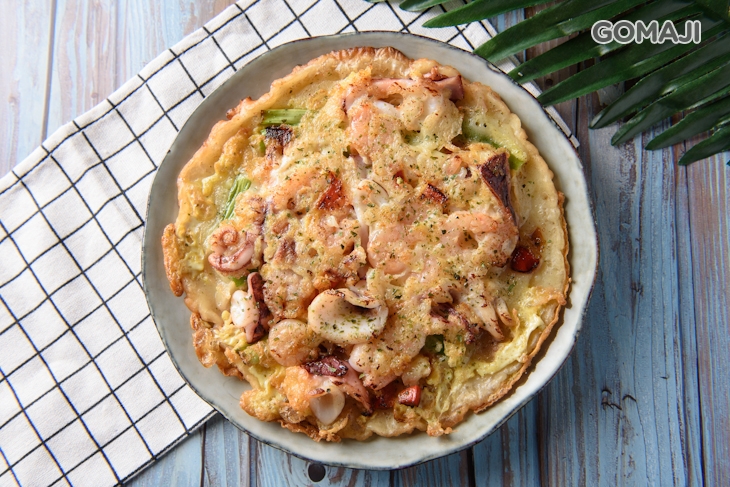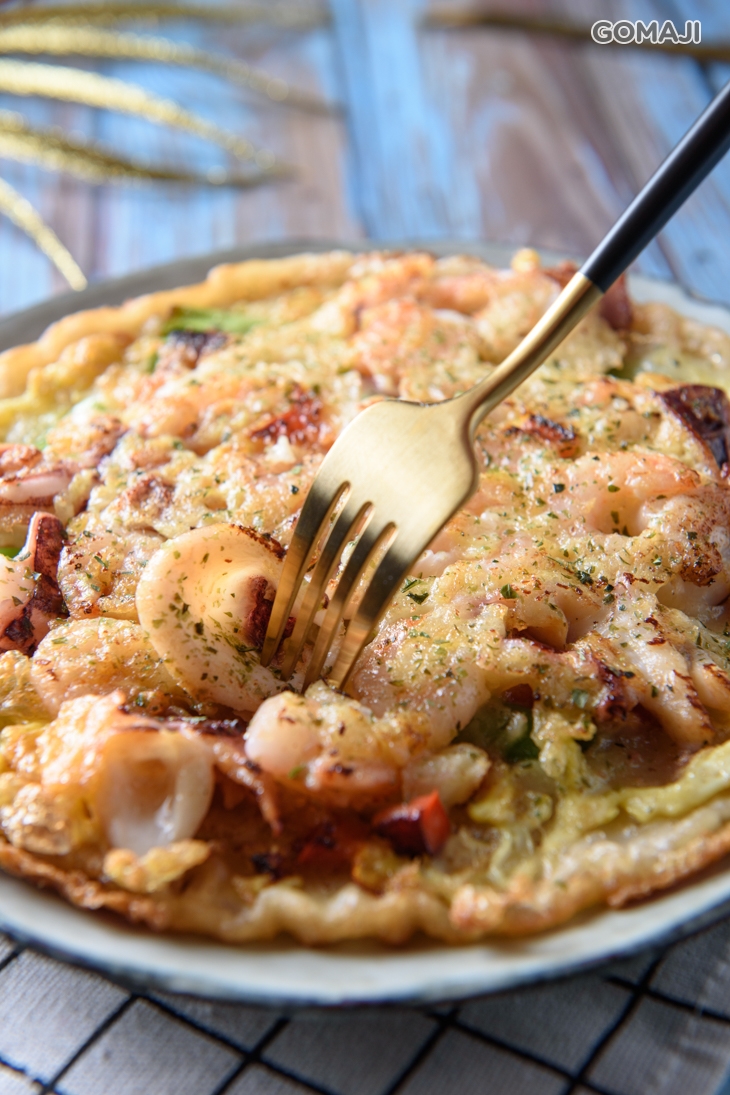 外表金黃軟脆的海鮮煎餅,飽滿紮實的海鮮用料,一口咬下,外脆內軟的滋味讓大朋友、小朋友通通愛不釋口,涮嘴的好滋味令人身心都感到滿足。