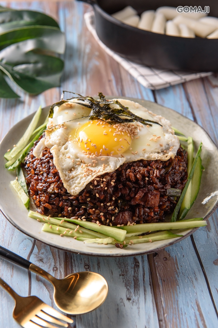 韓國人吃的炸醬,是墨黑的炸醬。也叫做「春醬」,用黑豆製成的。粒粒分明的米粒加上肉塊及洋蔥,拌炒均勻以後讓黑色炸醬入味,上面來顆滑溜半熟蛋及配菜、如虎添翼,炒飯控一定要嚐鮮哦!