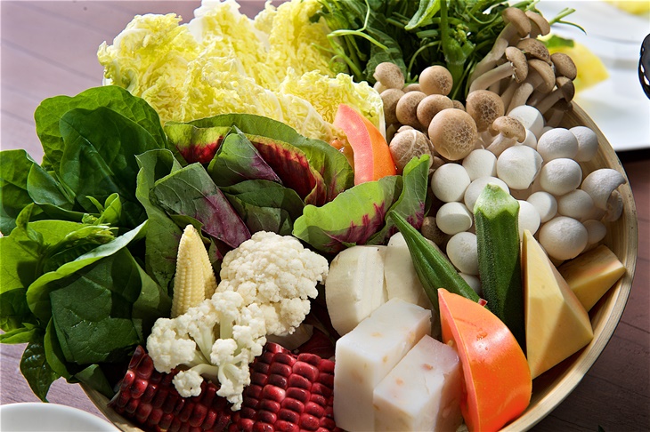 〈火鍋湯底:干貝雞肉(葷)/香茅蔬菜(素) 二選一 + 主食:Gaea 健康雞一份 + 菜盤一份(含大白菜+有機龍鬚菜+南瓜+有機甜玉米+栗子地瓜+番茄+鴻喜菇+美白菇) + 五行刀削麵一份 + 香草雞蛋二顆 + 甜點二份〉