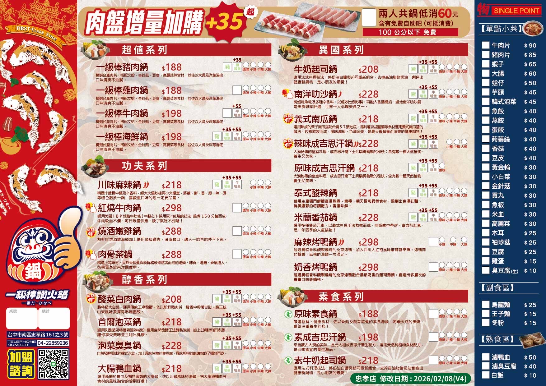 位於台中市區的【一級棒讚火鍋(忠孝店)】,顧名思義,以〝尚讚〞的精緻小火鍋為主打,包羅萬象的湯底口味、新鮮實在的用料,保證讓您一試成主顧!