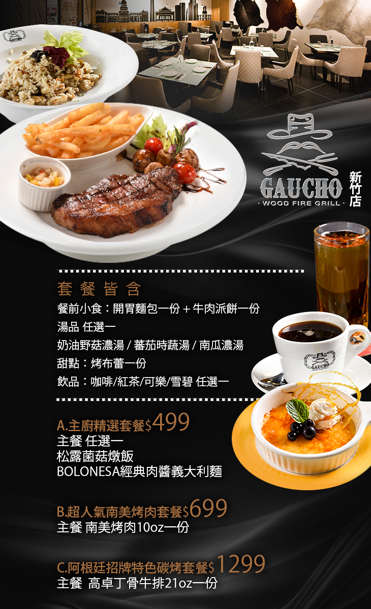 Gaucho 阿根廷炭烤餐廳穿越時空,將阿根廷傳統炭烤窯爐以及南美牛仔「高卓人」的炭烤牛肉呈獻於眼前,讓新竹的朋友們也有機會品嚐彭巴大草原的傳統美食。