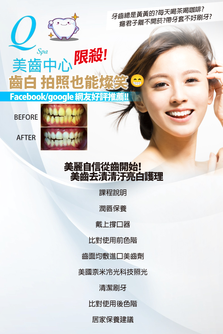 毎天喝茶、喝咖啡,牙齒總是黃黃的,別人都能自在的露出燦爛笑容,但您卻只敢淺淺的微笑嗎?Q spa 美齒中心還給您開懷大笑的機會!別再讓黃黃的牙齒束縛自己、降低自信心啦!牙齒可是人的門面,也是許多人相當注重的地方,特別使用漸進式美國奈米科技,搭配通過SGS檢驗合格的牙齒美白劑,過程不酸不痛,讓您的牙齒能夠持久亮白!