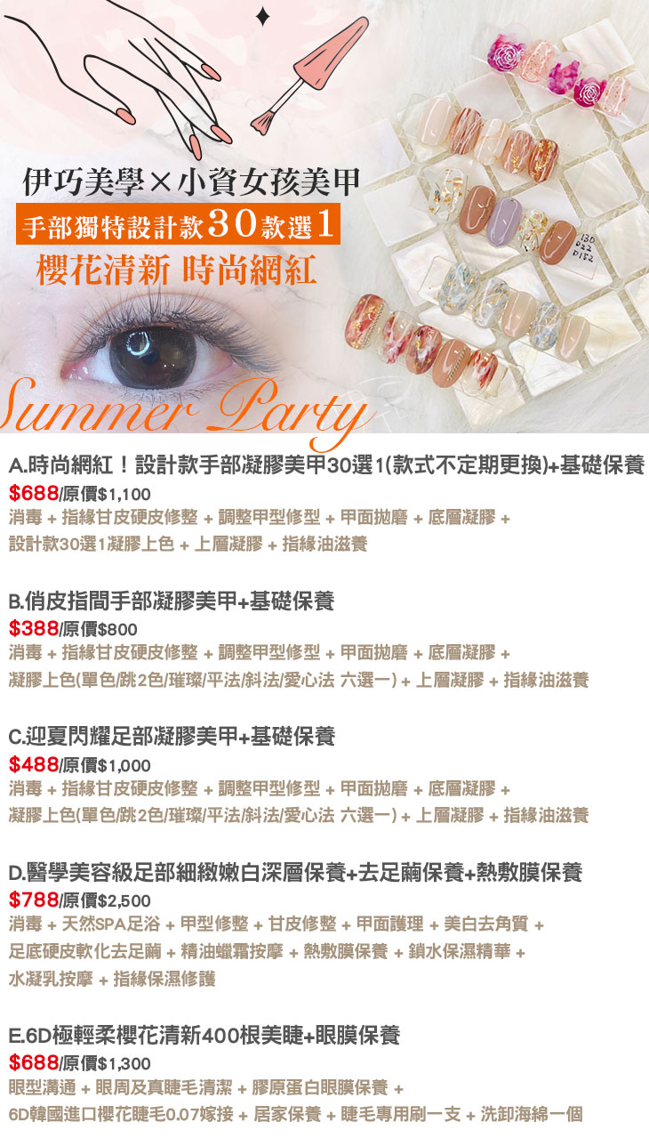 A.時尚網紅!設計款手部凝膠美甲30選1(款式不定期更換)+基礎保養 / B.俏皮指間手部凝膠美甲+基礎保養 / C.迎夏閃耀足部凝膠美甲+基礎保養 / D.醫學美容級足部細緻嫩白深層保養+去足繭保養+熱敷膜保養 / E.6D極輕柔櫻花清新400根美睫+眼膜保養