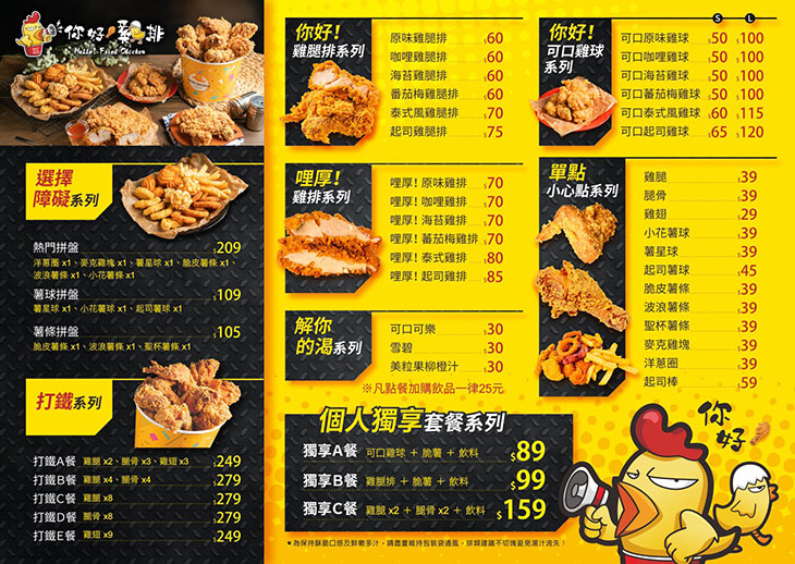 「Hello!你好!」熱情親切的店員像您打聲招呼,就如同店名所散發出的活力氣息!位於高雄市新興區中山一路上的〝你好!雞排〞,專營美味可口的炸雞及炸物點心,「我們向全世界打招呼,希望翻轉高雄,接軌世界,讓大家吃到雞肉的新鮮原味皮脆多汁肉嫩,讓大家重新認識雞排!」簡單的經營理念,卻能帶給您很不一樣的味覺衝擊,提供多樣的餐點選擇,讓您每口都吃得到外皮的酥炸香氣,感受雞肉的軟嫩多汁。優惠不等人,趕緊下手搶購吧!