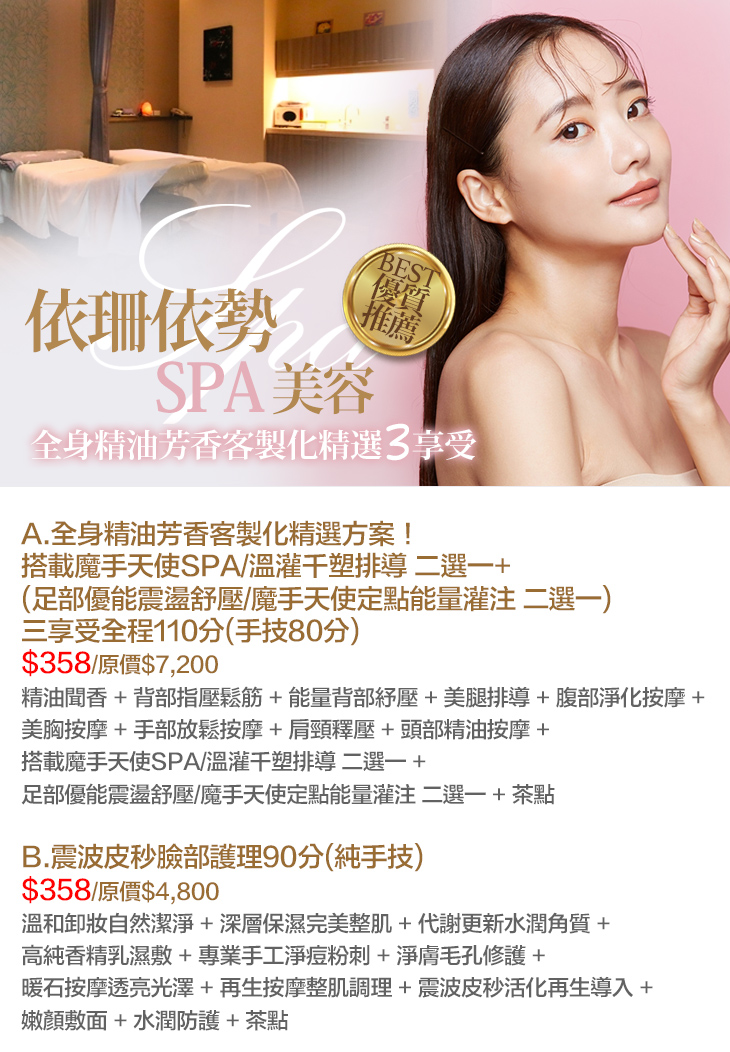 A.全身精油芳香客製化精選方案!搭載魔手天使SPA/溫灌千塑排導 二選一+(足部優能震盪舒壓/魔手天使定點能量灌注 二選一)三享受全程110分(手技80分) / B.震波皮秒臉部護理90分(純手技)