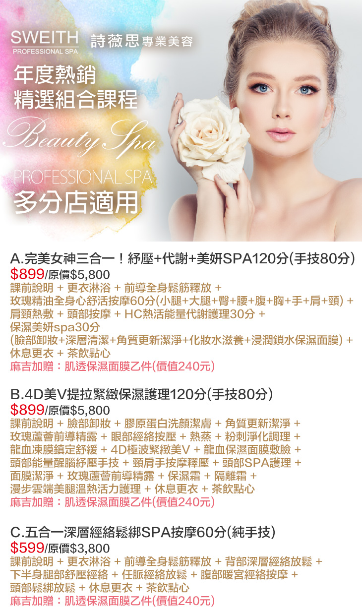 A.完美女神三合一!紓壓+代謝+美妍SPA120分(手技80分) / B.4D美V提拉緊緻保濕護理120分(手技80分) / C.五合一深層經絡鬆綁SPA按摩60分(純手技)